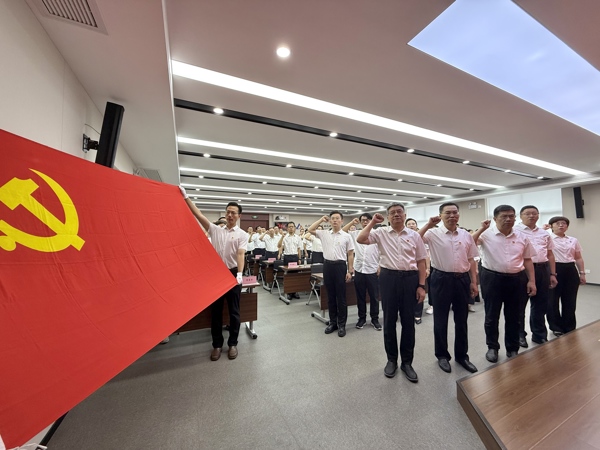 大會(huì)在莊嚴(yán)的國歌中拉開序幕。王振林帶領(lǐng)新接收預(yù)備黨員進(jìn)行集體宣誓,老黨員們重溫入黨誓詞。